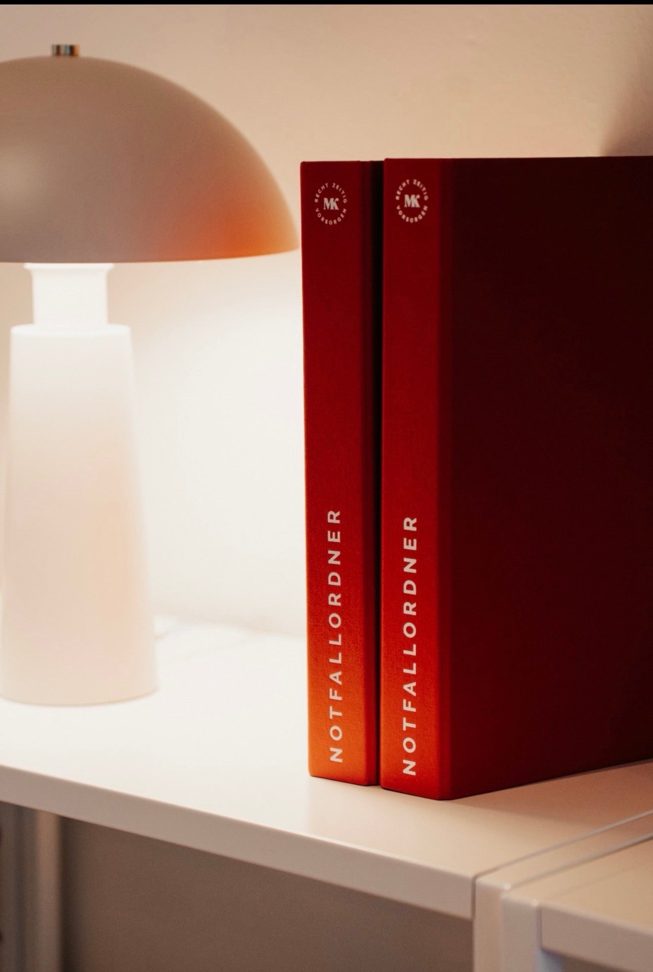 Alle wichtigen Dokumente, Listen und Unterlagen sollten in einem gut auffindbaren Notfallordner gesammelt werden. So ist im Ernstfall alles sofort griffbereit. Unser Notfallordner ist ein wunderschöner, hochwertig und nachhaltig produzierter knallroter Ringbuchordner, der aufgrund seiner Signalfarbe sofort in jedem Regal erkennbar und auffindbar ist. Er bietet genug Platz für all deine Vorsorgedokumente und enthält immer auch die Notfalllisten (s.o)!